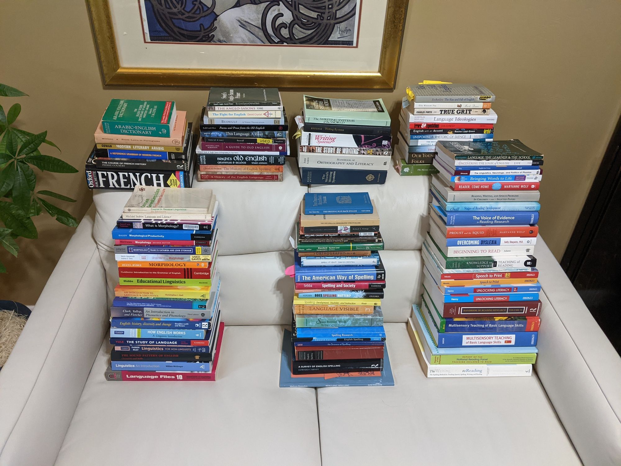 The photo at the top of this article shows 100 books that I consulted during the last few months of writing my dissertation, in stacks on the loveseat in my office, as I reorganize post-diss. Most, but not all, are actually in my Works Cited. This display doesn't include several books I have on Kindle, any of the motion pictures or poems I analyzed, any of the books I've checked out of libraries and returned, or any of the books or articles I have only in PDF format, including the works of Geoffrey Chaucer, in Middle English. There are six books on morphology alone. The three tall stacks on the loveseat feature linguistics books, orthography books, and literacy education books, from left to right. The four short stacks up top include foreign language books, Old English / Anglo-Saxon books, more orthography books, and books with stories and rhetorical studies.