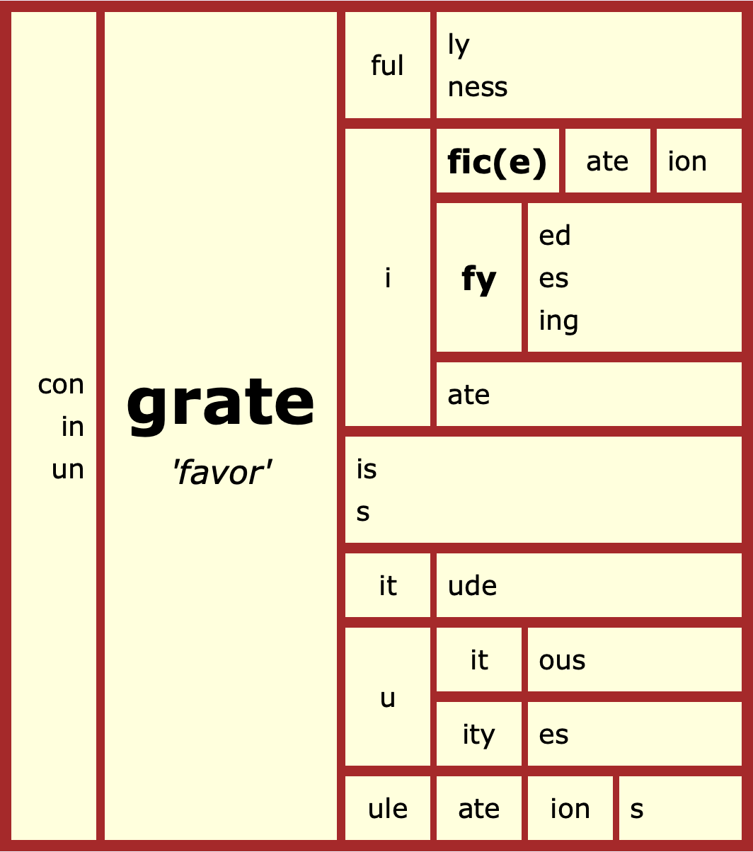 The orthographic structure of that word, grateful, is <grate> +< ful>. The <grate> is a bound base element, distinct from the word grate as in grate cheese, and also distinct from the word grate as in fireplace grate. There are, therefore, three homographic base elements <grate> – two free and one bound. The bound base element in grateful is shared by gratuity, gratuitous, gratitude, ingrate, gratify, and congratulations. Here is a lexical word matrix featuring this family: