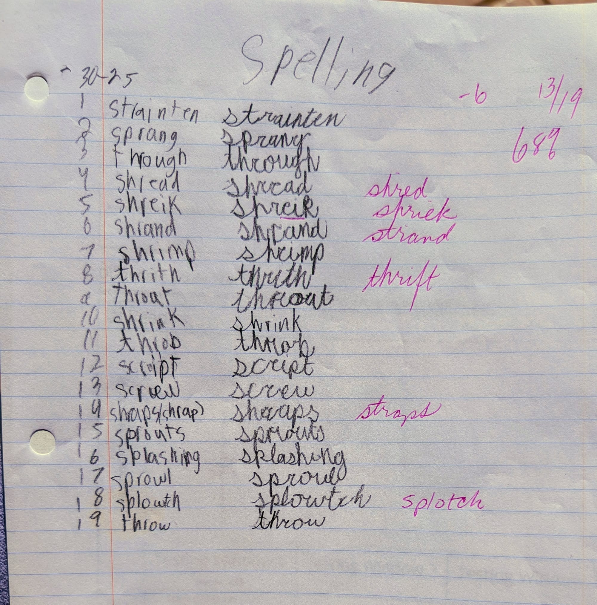 When I do come across a spelling test or assignment that appears to involve more trouble than usual, I take a picture so I can look for the pattern of what Poppy has missed or needs help with. One such test was given in October, and it targeted 3-letter initial consonant clusters, most of which start with the letter <s>.